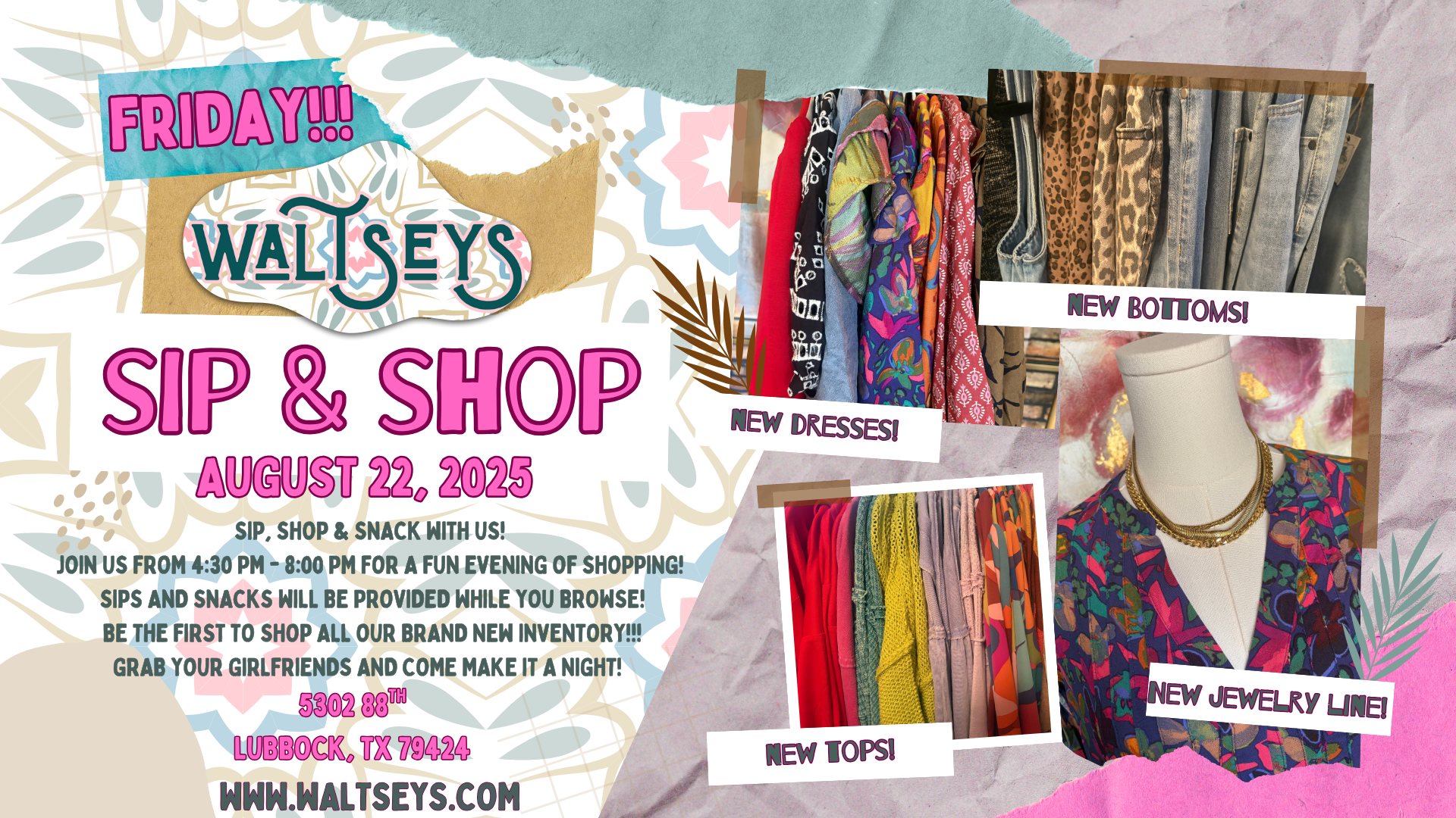 Sip & Shop Friday, August 22, 2025 4:30 PM 8:00 PM Waltseys 5302 88th Street Lubbock, TX, 79424 United States (map) Google Calendar ICS Sip, Shop & Snack with us!Join us from 4:30 PM - 8:00 PM for a fun evening of shopping! Sips and snacks will be provided while you browse! Be the first to shop all our brand new inventory!!! Grab your girlfriends and come make it a night!XOXO -Lindsey
