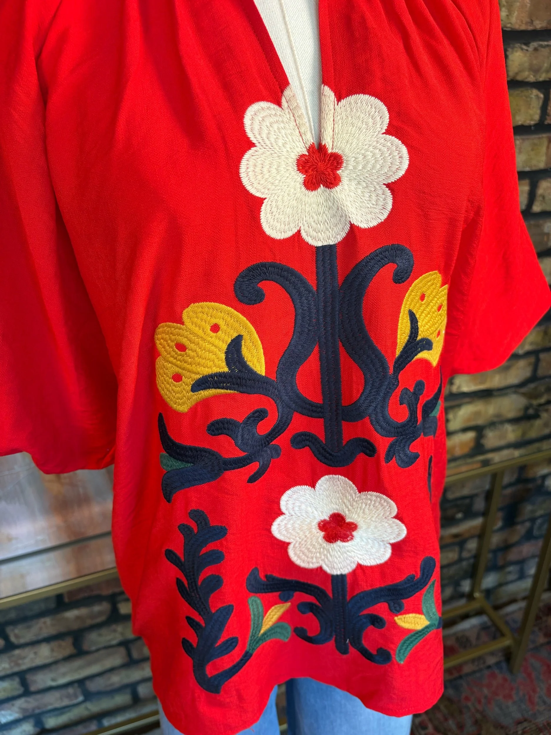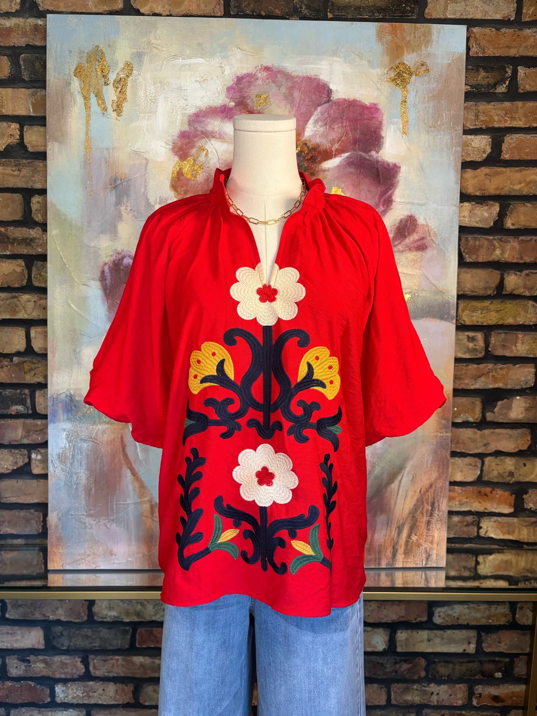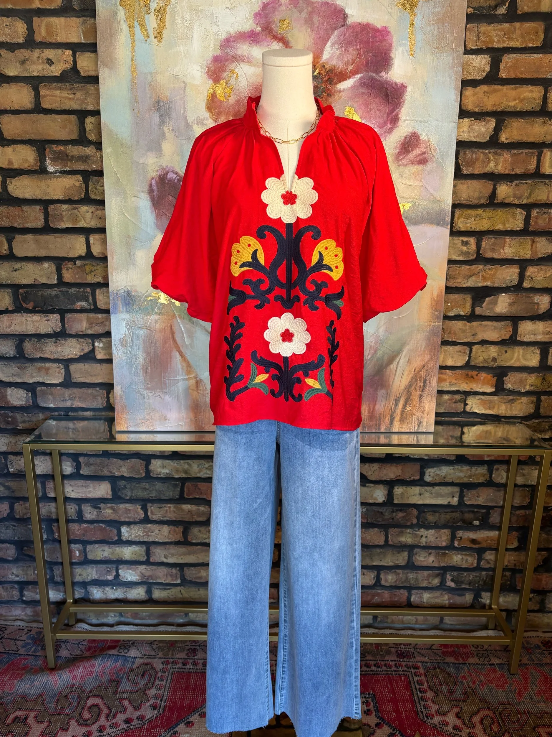 Shop › Red Embroidered V Neck Image 1 of 3 Image 2 of 3 Image 3 of 3 Red Embroidered V Neck $44.00 Size: Small Medium Large Get notified by email when this product is in stock. Add to Cart Added! You Might Also Like Black Knitted Top $46.00 Breezy Top - Magenta (One Left!) from $19.20 Sale Western Black Tee $54.00 Floral Sleeve Top - Red $38.00 Pink Multi Top $48.00