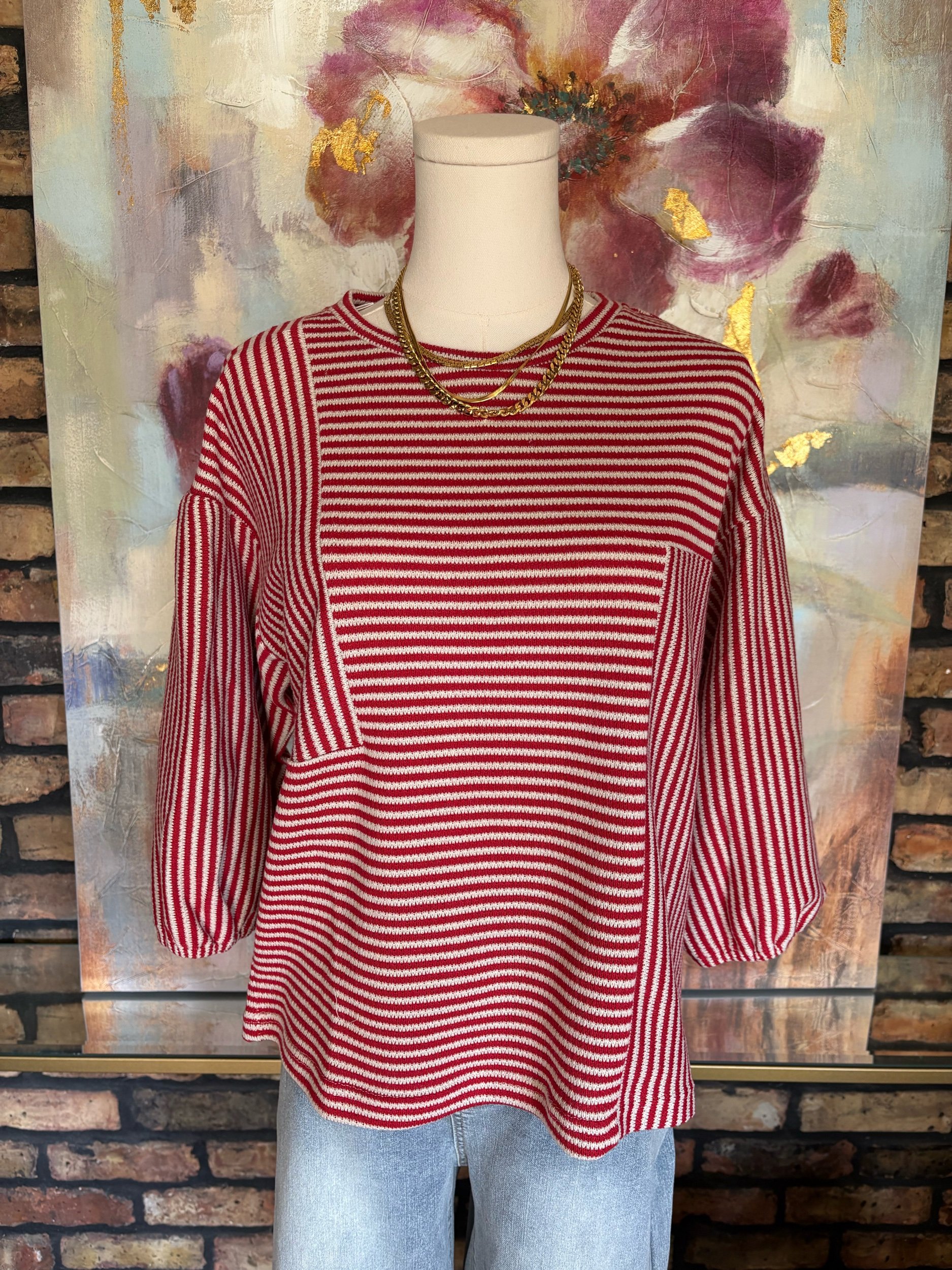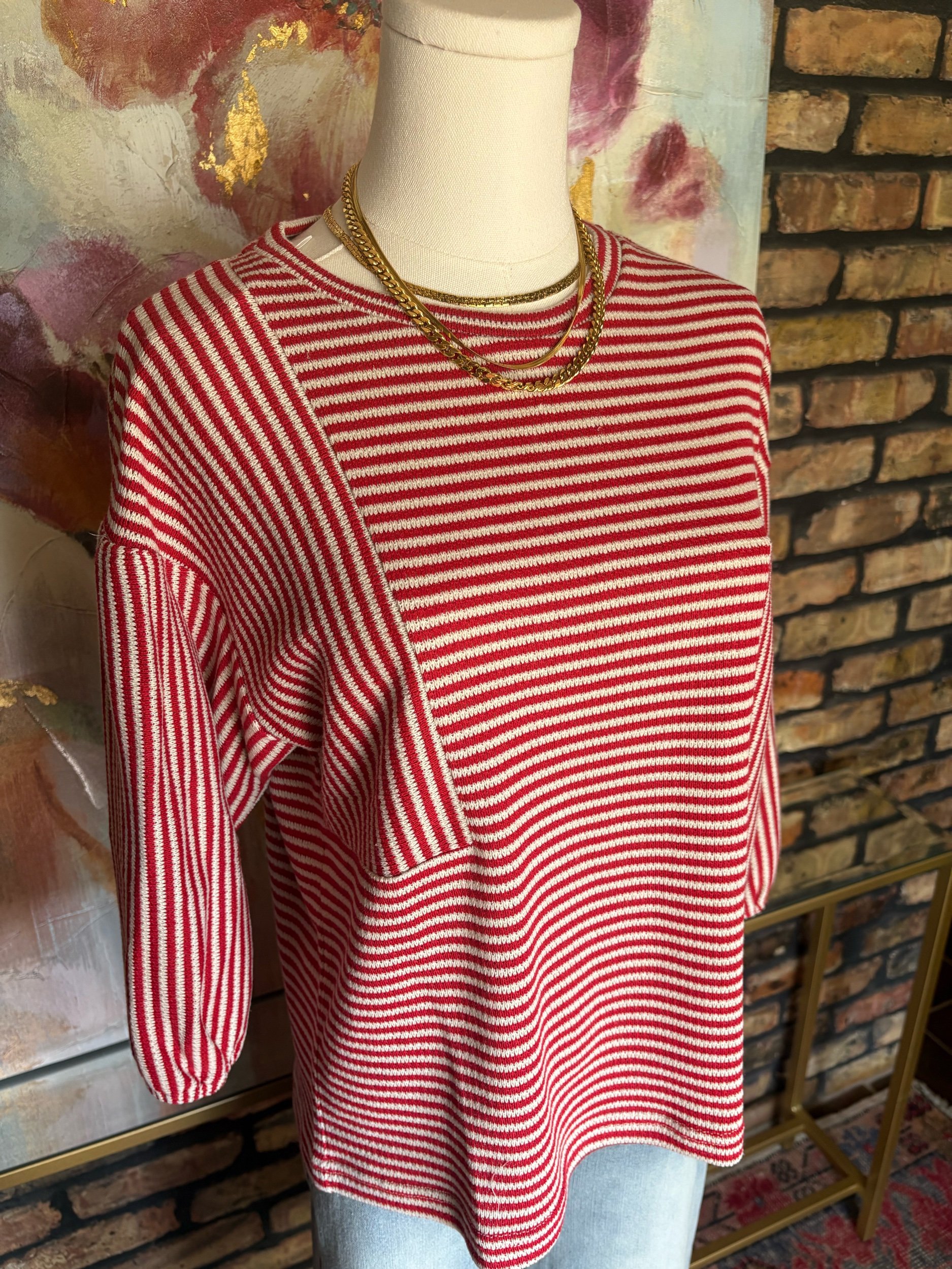 Cozy meets cool in this red + ivory striped knit that instantly gives effortless vibes. Designed with a modern patch panel detail and relaxed silhouette, this top offers a fresh take on classic stripes. The lightweight sweater material makes it perfect for year-round wear — warm enough for breezy days, yet breathable for everyday styling.